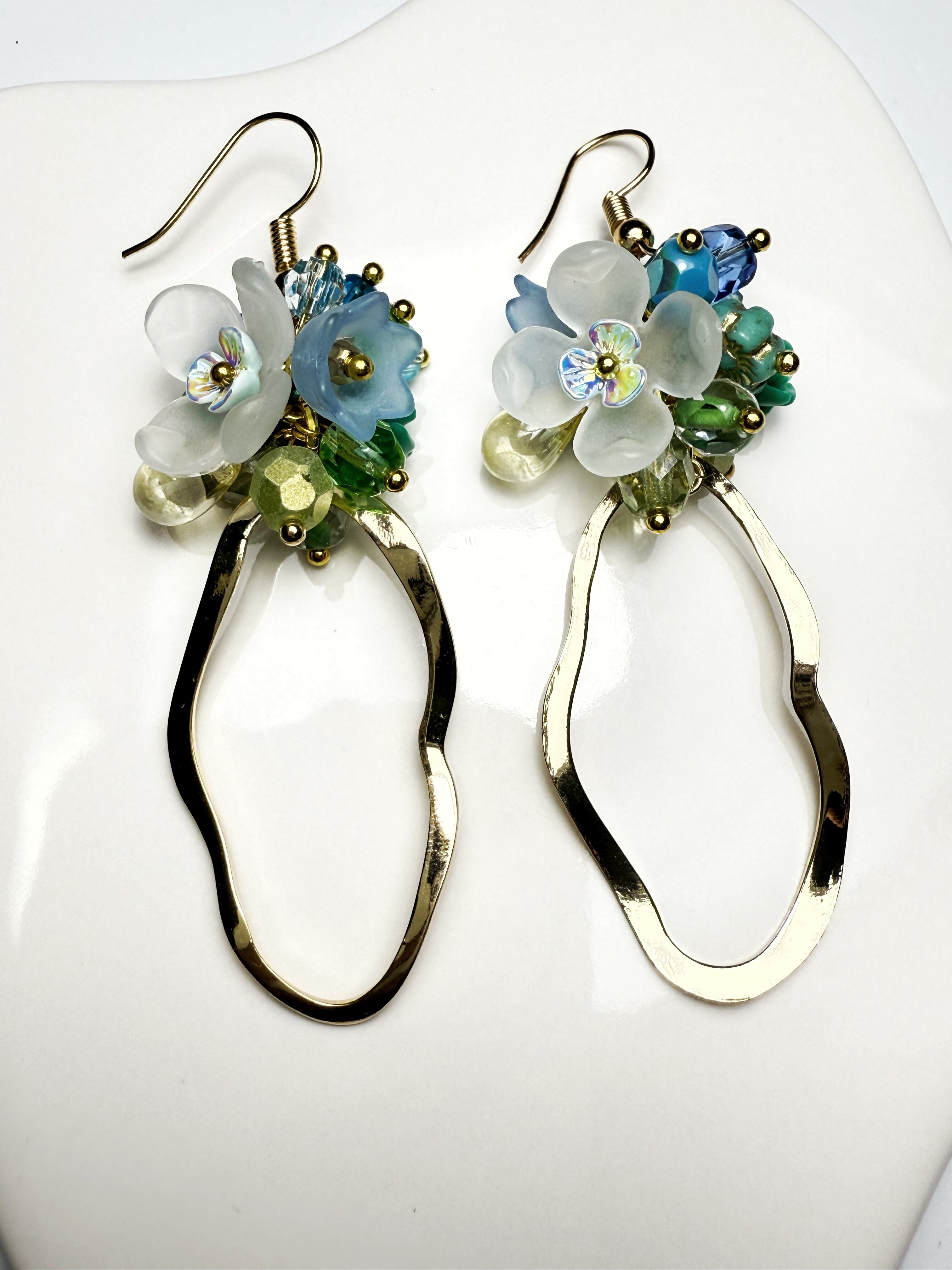ブルー.グリーン系のパーツとゴールドのうねうねチャームが大人かわいいピアスです☺︎